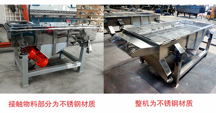 直線振動篩有兩種選擇方式:①接觸物料部分爲不鏽鋼材質,其他部分爲碳鋼材質,②整機爲不鏽鋼材質,具體選擇哪種不鏽鋼直線振動篩,還需要根據物料性質以及用戶的實際需求選用不同的材質,如果您的适用場景對衛生要求高的話可以采用第二種方案。