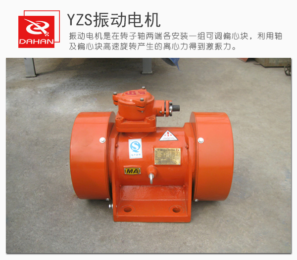 YZS振動電機是動力源與振動源結合爲一體的激振源,振動電機是在轉子軸兩端各安裝一組可調偏心塊,利用軸及偏心塊高速旋轉産生的離心力得到激振力。